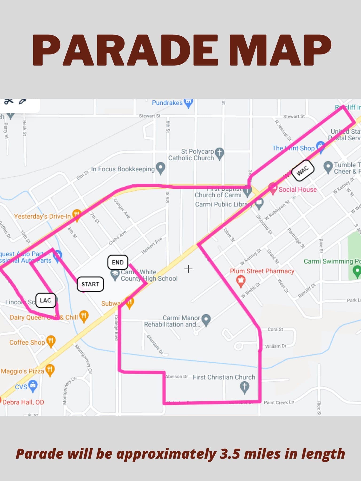 You are encouraged to line up along the route and participate by showing your Carmi-White County school spirit as the parade will end the homecoming week festivities for students.
